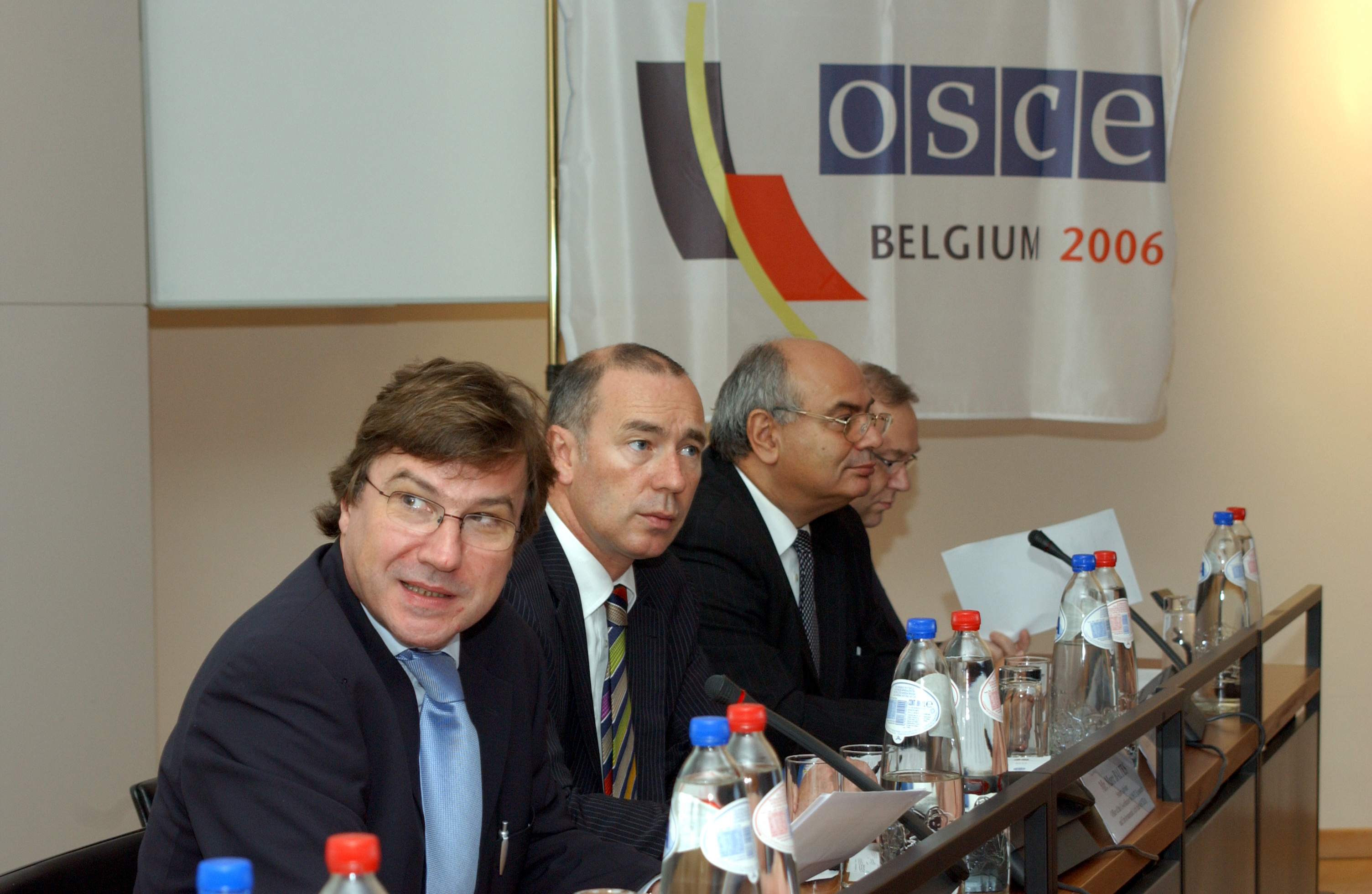 Ambassador Frank Geerkens (left), Head of the Belgian Foreign Ministry's OSCE Chairmanship Unit, addresses a workshop on port security jointly organized by the OSCE and the International Labour Organization, in Antwerp, 6 October 2006.
