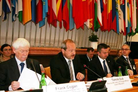 L-r: Ambassador Frank Cogan, Head of OSCE Irish Chairmanship Taskforce, Tomáš Dub, Deputy Foreign Minister of Czech Republic, Brian Hayes, Minister of State at the Department of Finance of Ireland representing the OSCE Chairmanship, and Goran Svilanovic, the Co-ordinator of OSCE Economic and Environmental Activities, at the 20th OSCE Economic and Environmental Forum, Prague, 12 September 2012.