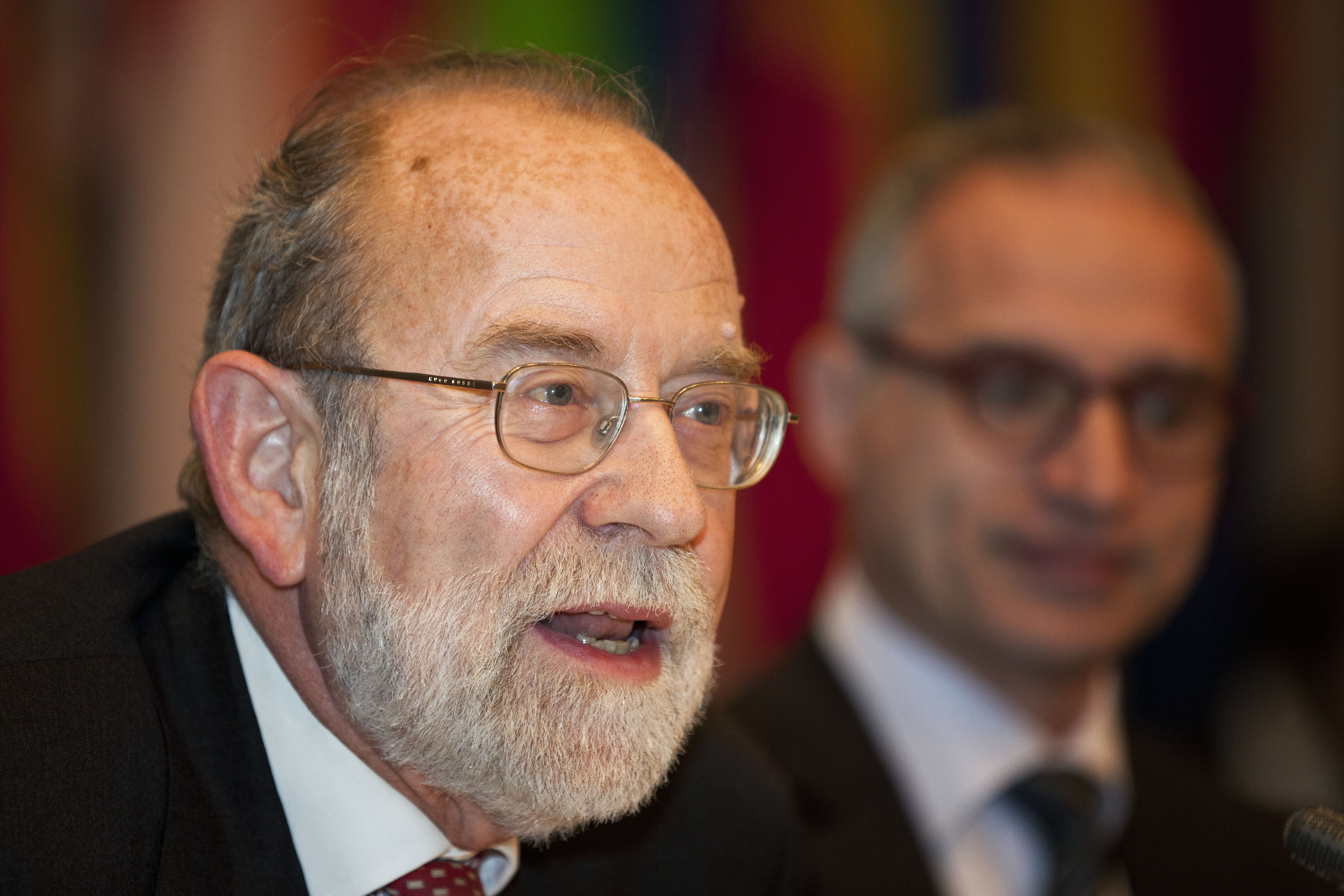 Bernard Snoy, the Co-ordinator of OSCE Economic and Environmental Activities from 2005 to 2008, speaks at the opening of the Economic and Environmental Dimension Implementation Meeting at the Hofburg in Vienna, 16 October 2012, as his successor, Goran Svilanović, looks on.
