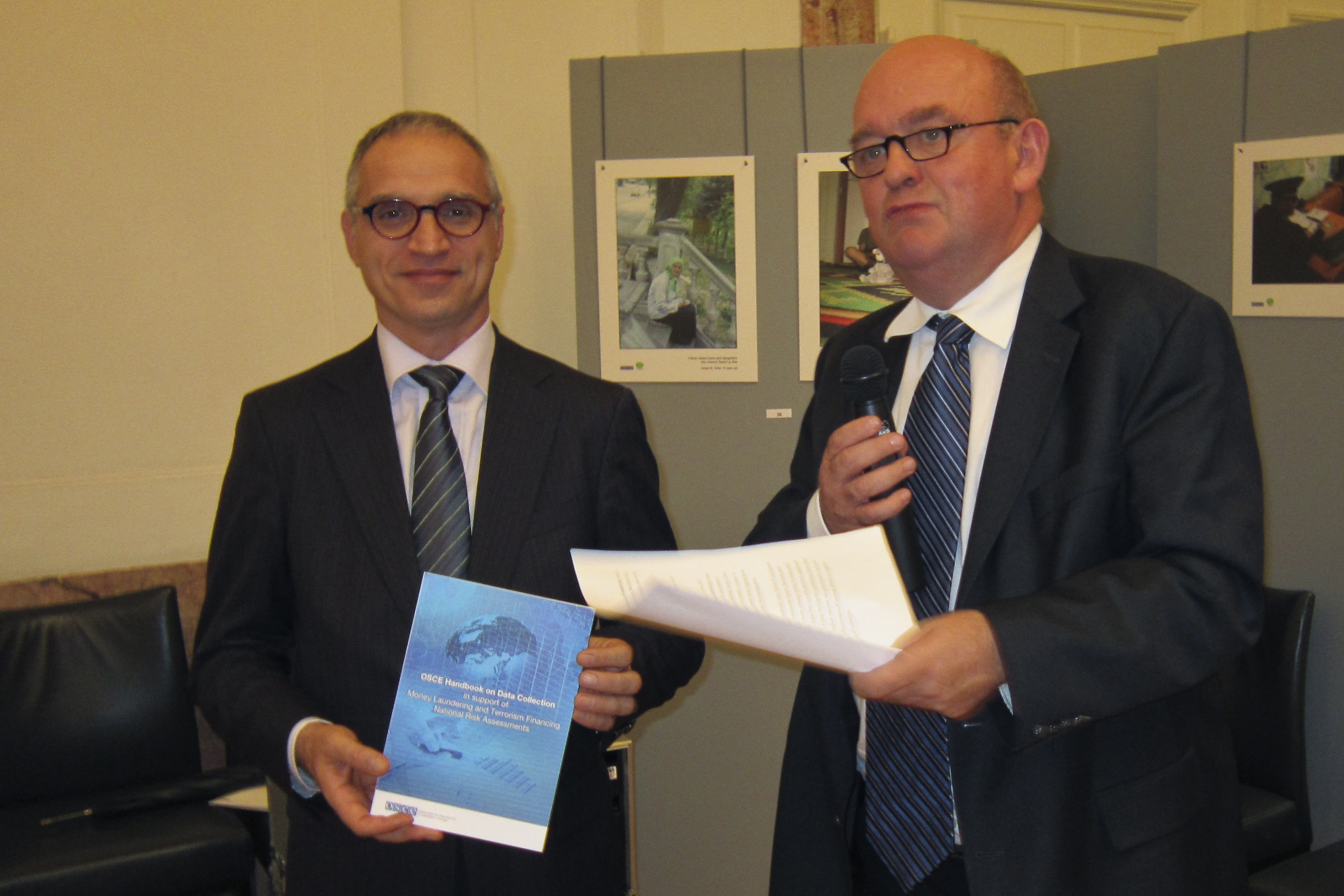 Ireland's Permanent Representative to the OSCE, Ambassador Eion O'Leary (r), and Goran Svilanović, Co-ordinator of OSCE Economic and Environmental Activities, introduce the "OSCE Handbook on Data Collection in support of Money Laundering and Terrorism Financing" at an event at the Hofburg, Vienna, 16 October 2012.