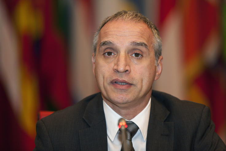 Goran Svilanović, Co-ordinator of OSCE Economic and Environmental Activities, delivers a report to the OSCE's Permanent Council at the Hofburg in Vienna, 25 October 2012.