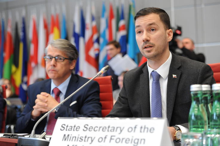 Lukáš Parízek (r), State Secretary of Slovakia’s Foreign and European Affairs Ministry and Ambassador Radomír Boháč, Permanent Representative of Slovakia to the OSCE speaking at the opening session of Slovakia’s Chairmanship of the Forum for Security Co-operation, Vienna, 17 January 2018.