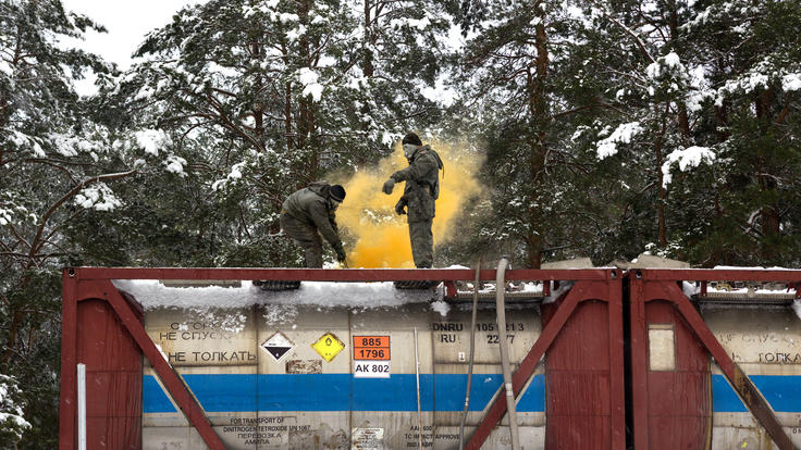 Technical experts loading the chemicals into containers to transport them to disposal facilities, Kalinkovichi, Belarus, 5 December 2017.