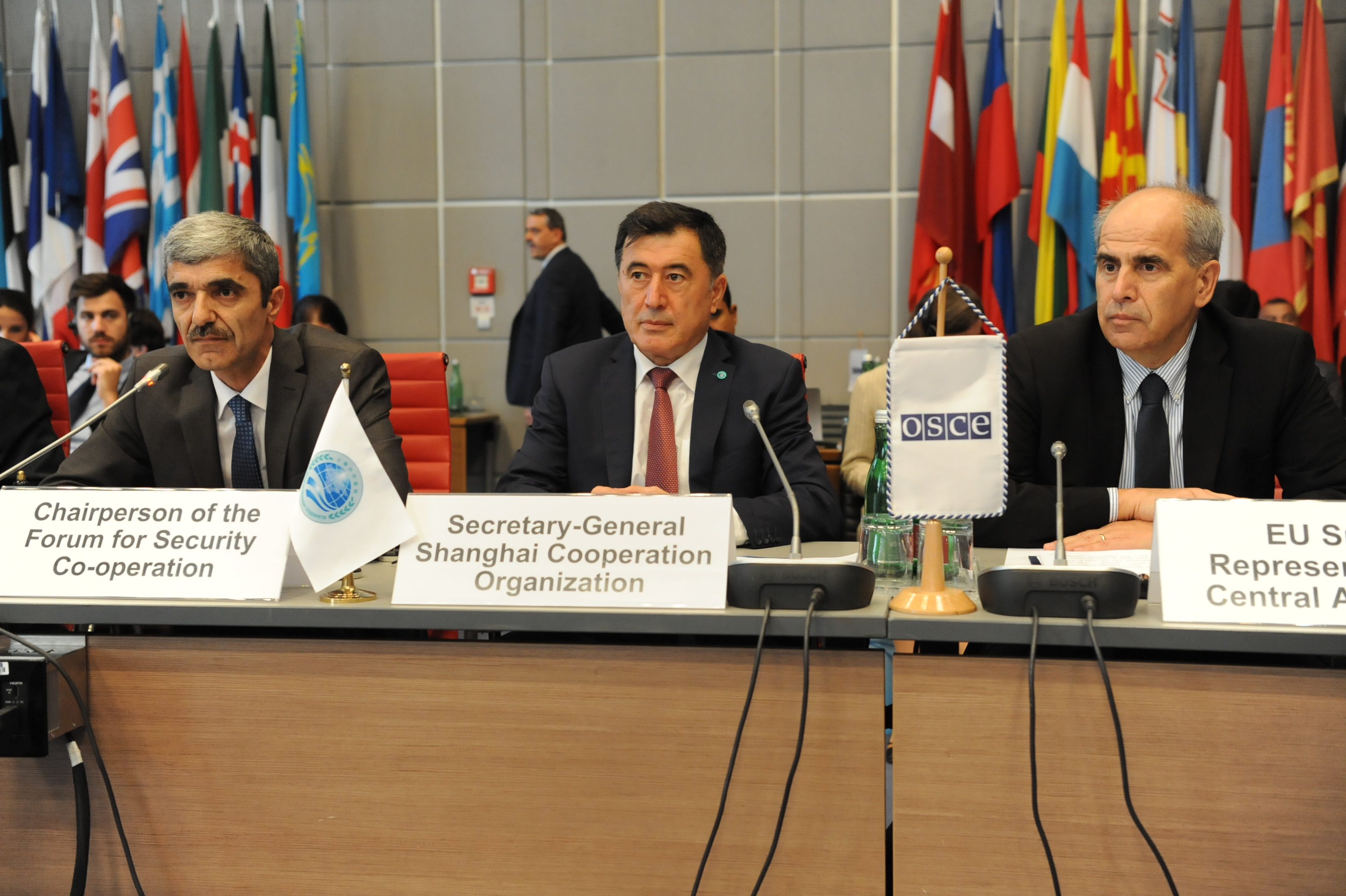 (L-r) Ambassador Idibek Kalandar, Chairperson of the Forum for Security Co-operation (FSC) and Head of Tajikistan’s Delegation to the OSCE; Vladimir Norov, Secretary General of the Shanghai Co-operation Organization; and the EU Special Representative for Central Asia, Peter Burian of the European External Action Service (EEAS), prepare to take the floor at the FSC meeting, Vienna, 11 July 2019.