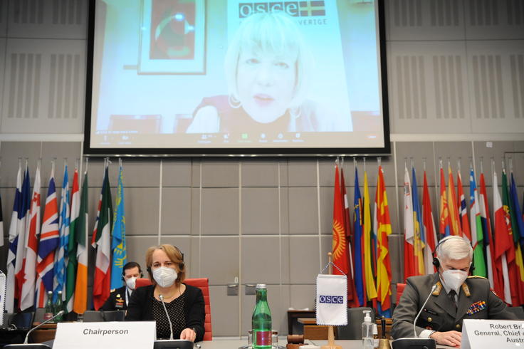 (L-R): Courtney Austrian, United States FSC Chairperson; Helga Maria Schmid, OSCE Secretary General; and Robert Brieger, General and Chief of Defence Staff of the Austrian Armed Forces at the opening session of the OSCE High-Level Military Doctrine Seminar, 9 February 2021.