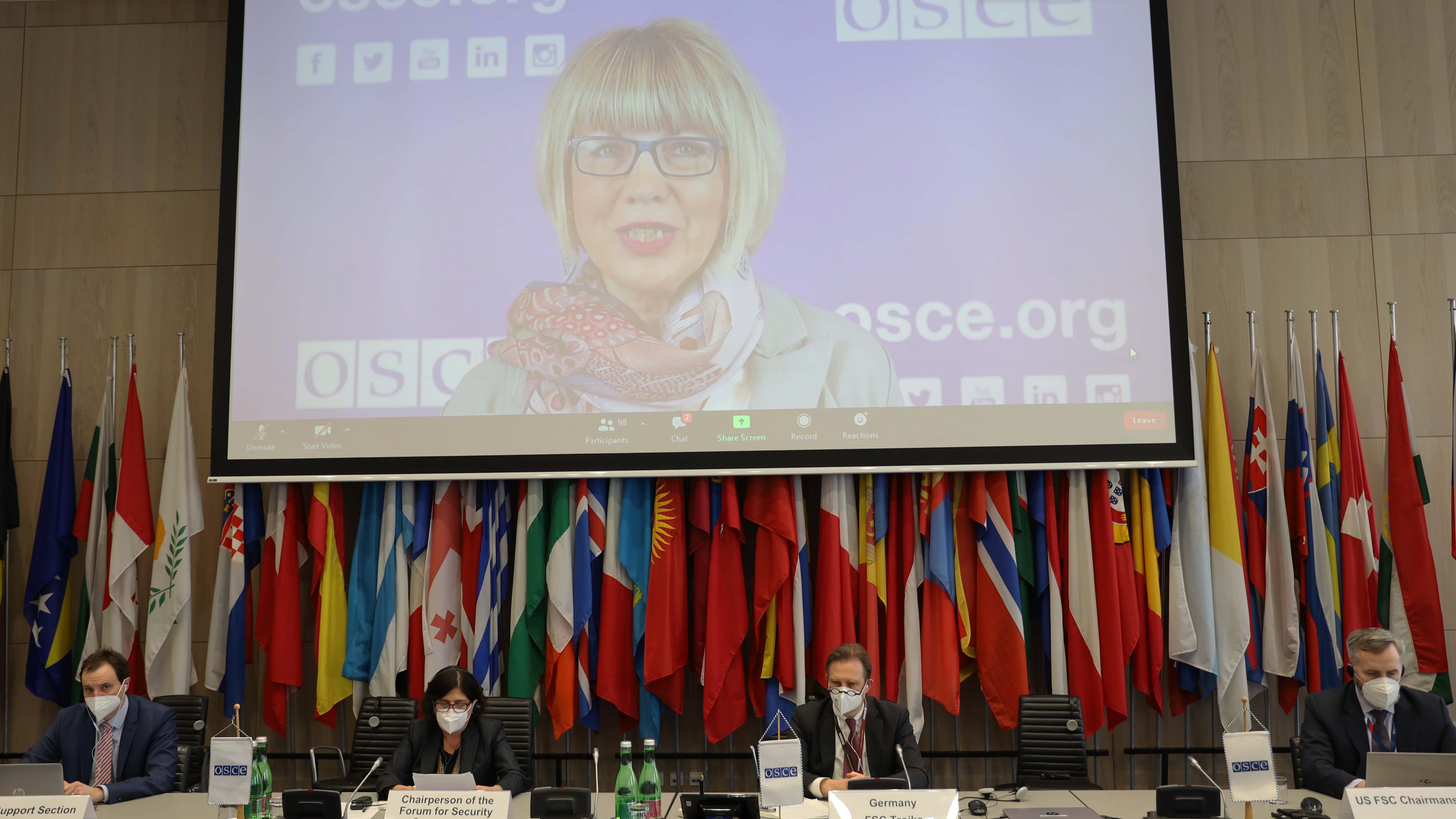 (L-R): Representative of the OSCE Forum for Security Co-operation (FSC) Support Section; Demitra Pappas, Counselor and Chief Arms Control Delegate, United States FSC Chairpersonship; Helga Maria Schmid, OSCE Secretary General [on screen]; Albrecht von Wittke, Head of Division Conventional Disarmament, Arms Control and CSBM Worldwide at Germany's Federal Foreign Office; Representative of US FSC Chairpersonship at the Donor Meeting on Strengthening OSCE Action Against the Illicit Proliferation of SALW and SCA in South-Eastern Europe, 24 March 2021.
