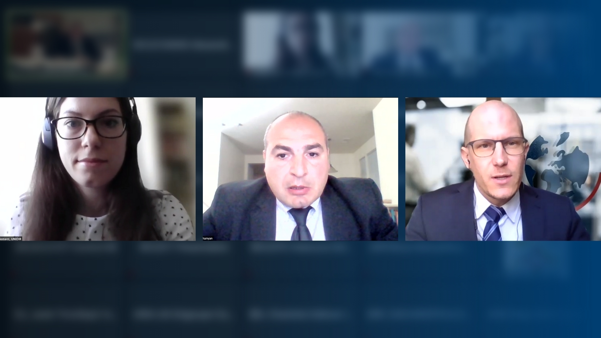 (l-r) Sarah Grand Clement, Researcher in the Security, Technology and Conventional Arms Programmes at the United Nations Institute for Disarmament Research; Colonel Zhirayr Amirkhanyan, Ministry of Defense of Armenia; Tobias Vestner, Head of the Security and Law Programme at the Geneva Centre for Security Policy speaking at the OSCE Forum for Security Co-operation, 12 May 2021.