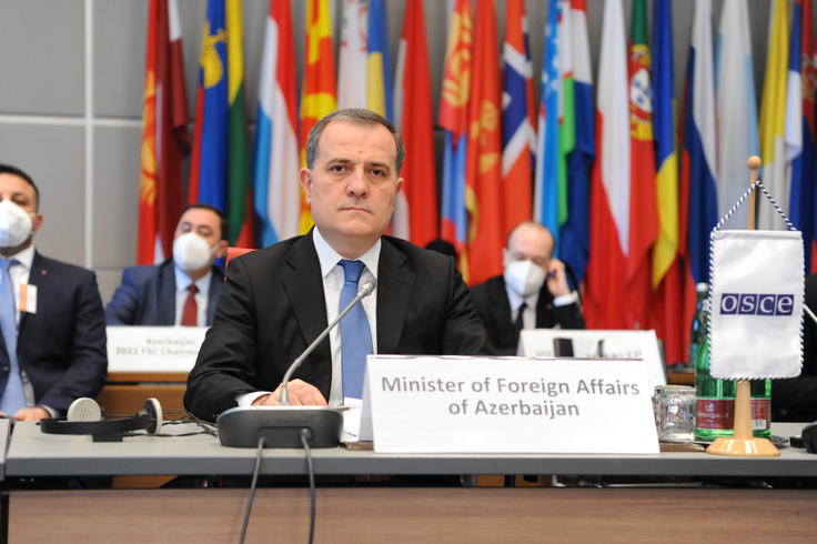 Jeyhun Bayramov, Minister of Foreign Affairs of Azerbaijan, opening the Azerbaijani Chairmanship of the OSCE Forum for Security Co-operation (FSC), Vienna, 19 January 2022 (OSCE/Micky Kroell).