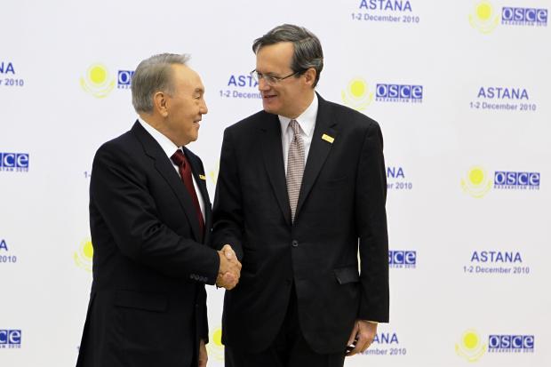 Le Président kazakh, M. Noursoultan Nazarbaïev, accueille M. Marc Perrin de Brichambaut, Secrétaire général de l’OSCE, à l’occasion de l’ouverture du Sommet d’Astana, le 1er décembre 2010.
