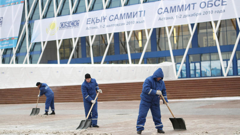 Une bannière aux couleurs de l’OSCE, Astana, le 28 novembre 2010.
