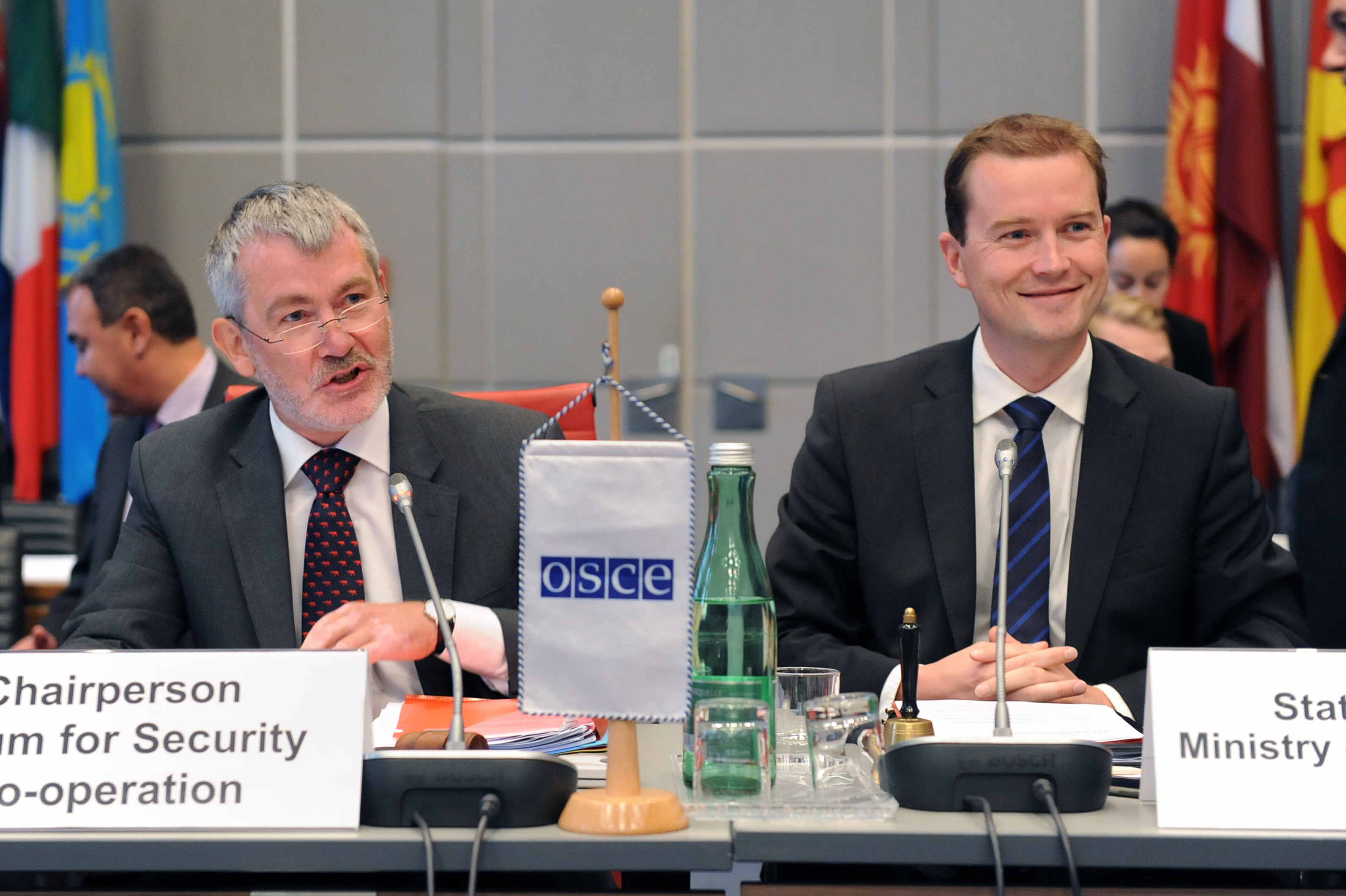 State Secretary of the Ministry of Foreign Affairs of Norway Bård Glad Pedersen (r) and Ambassador Robert Kvile, FSC Chairperson and Head of the Permanent Delegation of Norway to the OSCE (l), outlining 2015 priorities of Norway's Chairmanship of the OSCE Forum for Security Co-operation at a meeting of the Forum, Vienna, 9 September 2015.