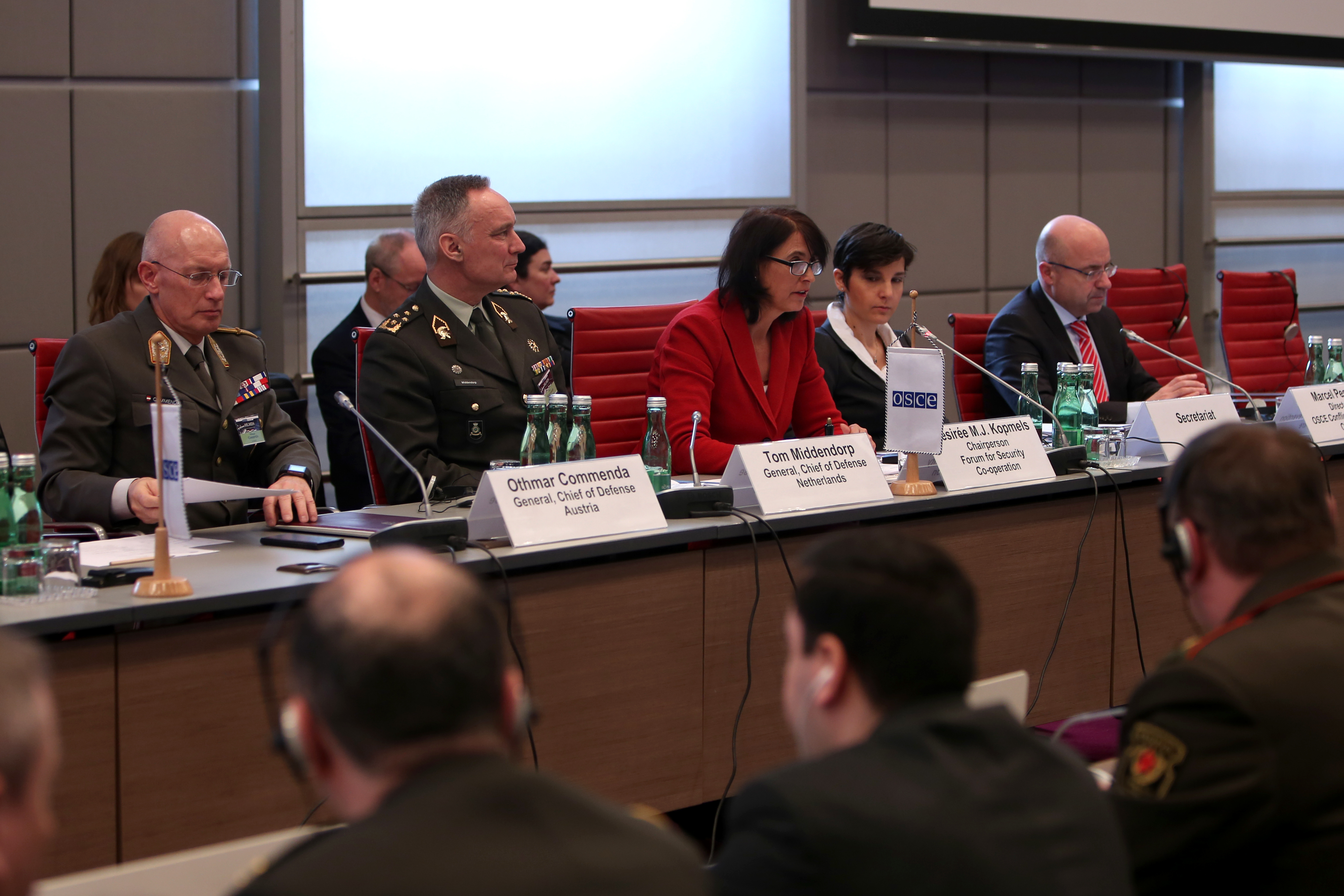 (L-r) Key speakers General Othmar Commenda, the Chief of Defence Staff of the Austrian Armed Forces, General Tom Middendorp, the Chief of Defence of the Armed Forces of the Netherlands, and Ambassador Desirée Kopmels, Permanent Representative of the Netherlands to the OSCE, at the opening of the OSCE High-Level Military Doctrine Seminar, Vienna, 16 February 2016.