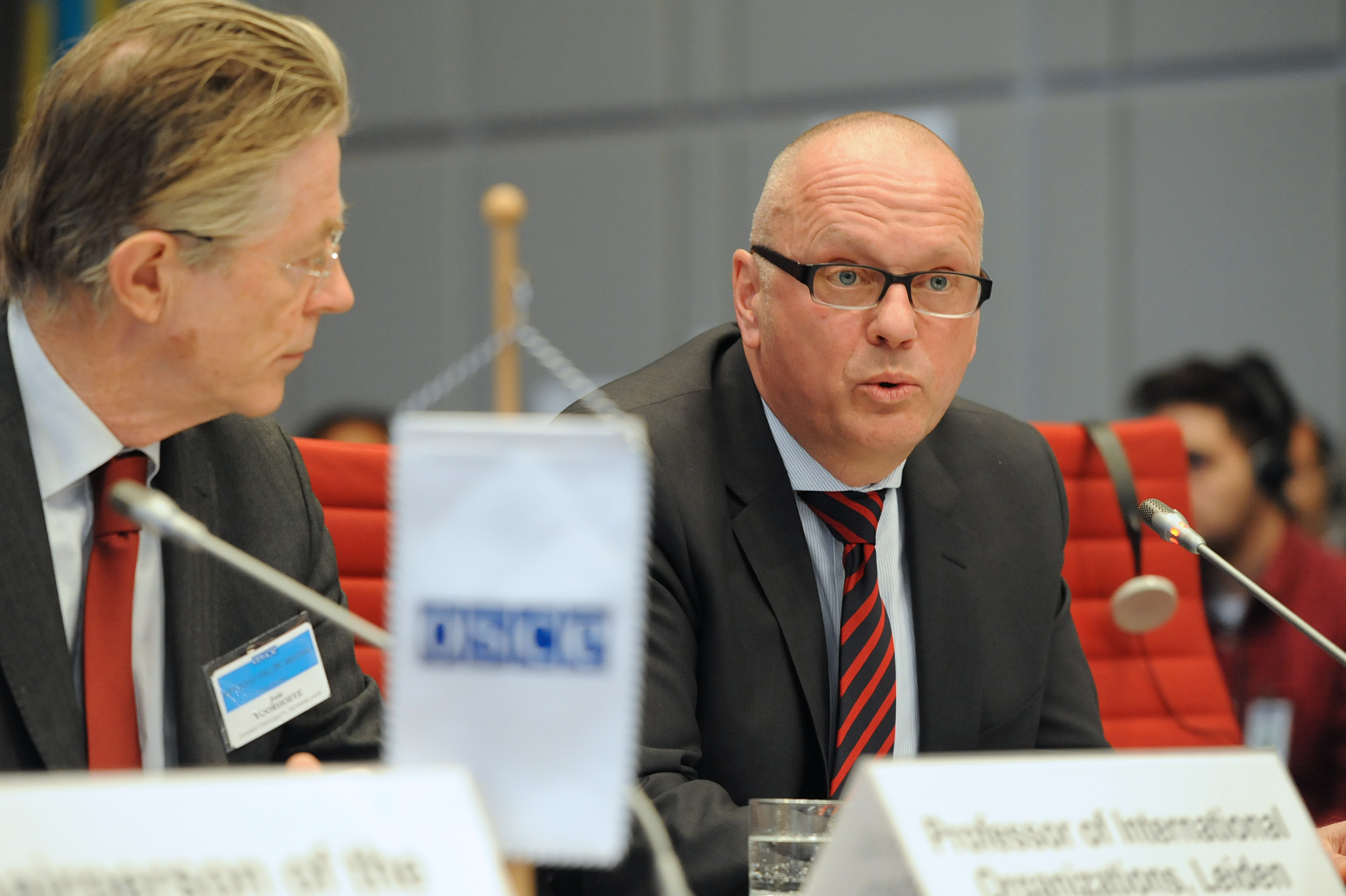 (l-r) Joris Voorhoeve, Professor of International Organizations, Leiden University in the Netherlands and Andreas Michaelis, Germany's Political Director of the Ministry of Foreign Affairs, speaking at a joint session of the OSCE Forum for Security Co-operation and Permanent Council, Vienna, 9 March 2016.