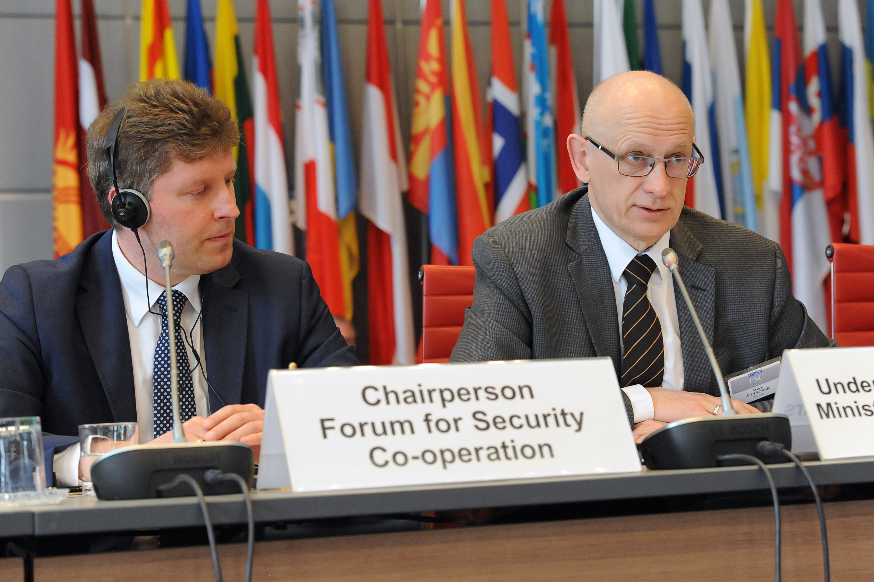 Marek Ziółkowski, Under-Secretary of State, Poland's Foreign Ministry (r), outlining 2016 priorities of Poland's Chairmanship of the OSCE Forum for Security Co-operation at a meeting of the Forum, Vienna, 13 April 2016.