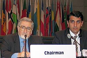 Head of the Armenian delegation to the OSCE, Amb. Jivan Tabibian (left), chairs the Forum for Security and Co-operation in Vienna, 26 May 2004. Varuzhan Nersessian, of the Armenian delegation, looks on.