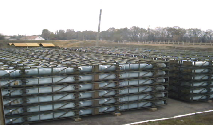 "Uragan" missiles stored under the sky. OSCE's Forum for Security Co-operation focuses on destroying stockpiles of deteriorating surplus conventional weapons and munitions, left over from the Cold War era.