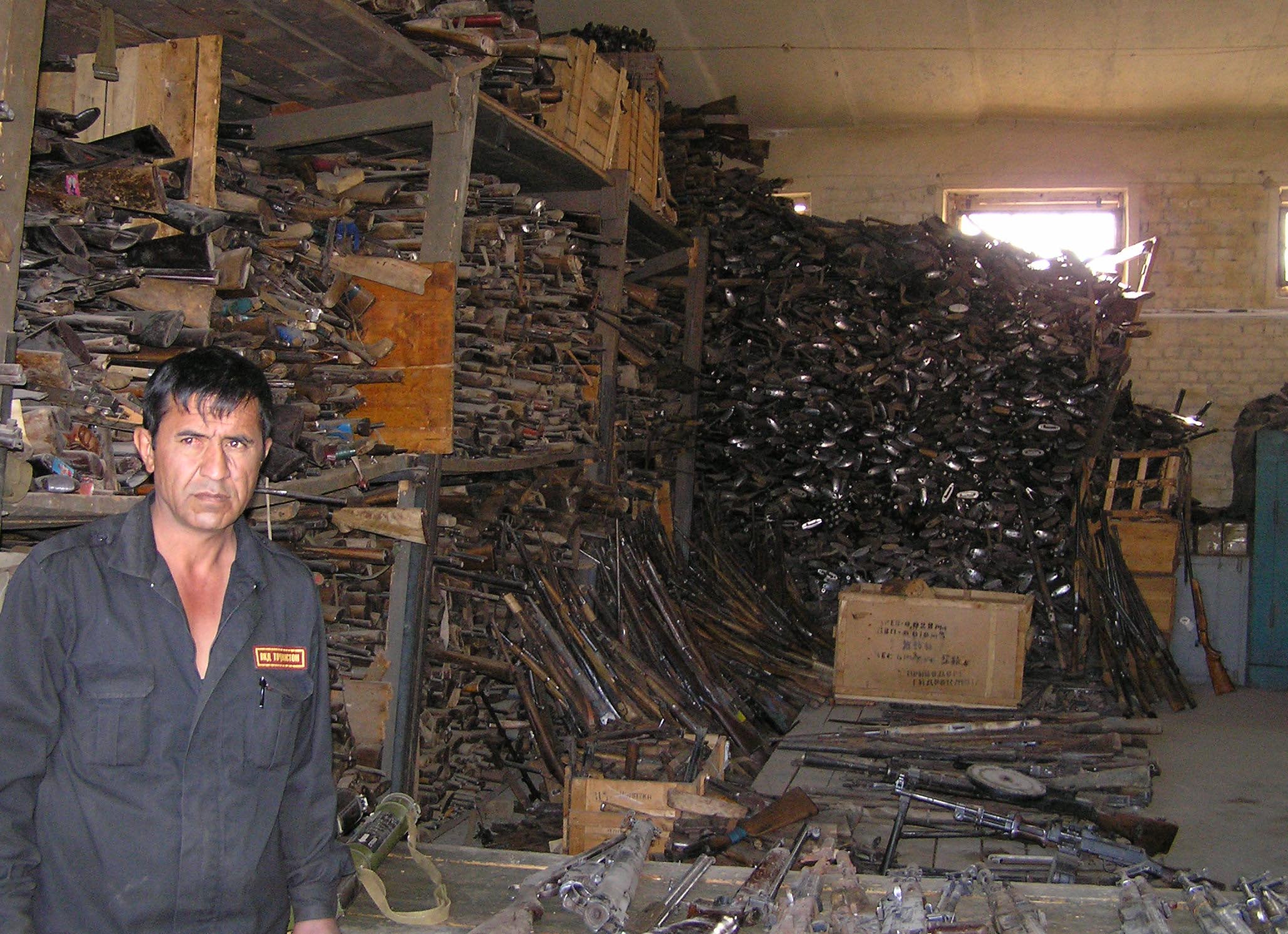 Small arms stored in Tajikistan, 2004. The OSCE Forum for Security Co-operation helps destroy stockpiles of deteriorating surplus conventional weapons and munitions left over from the Cold War era.