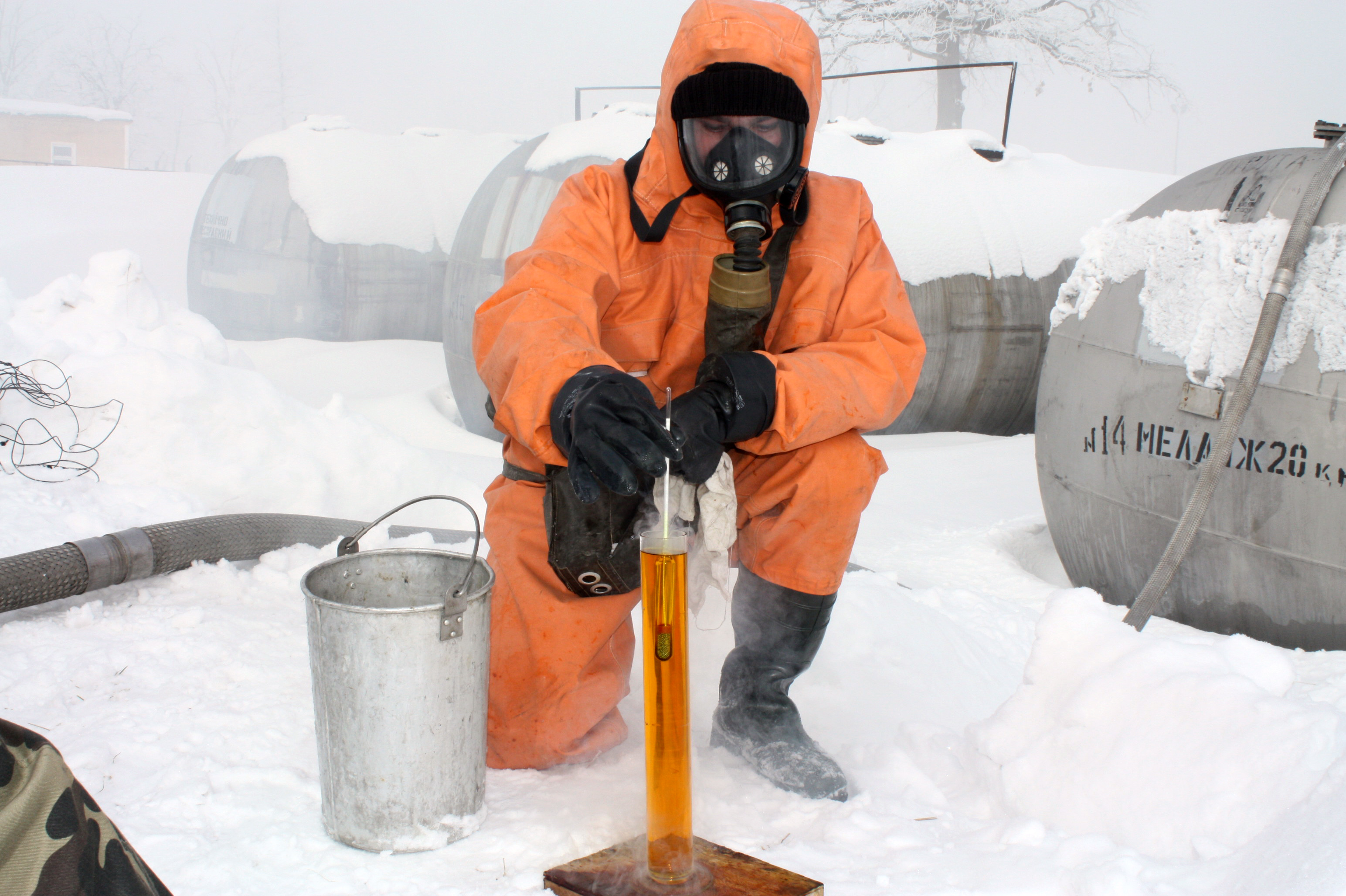 A member of the Ukrainian military takes a sample of the toxic rocket fuel component melange at the depot in Radekhiv, Ivano-Frankivsk region of Ukraine, before it is shipped for disposal, 17 February 2010.