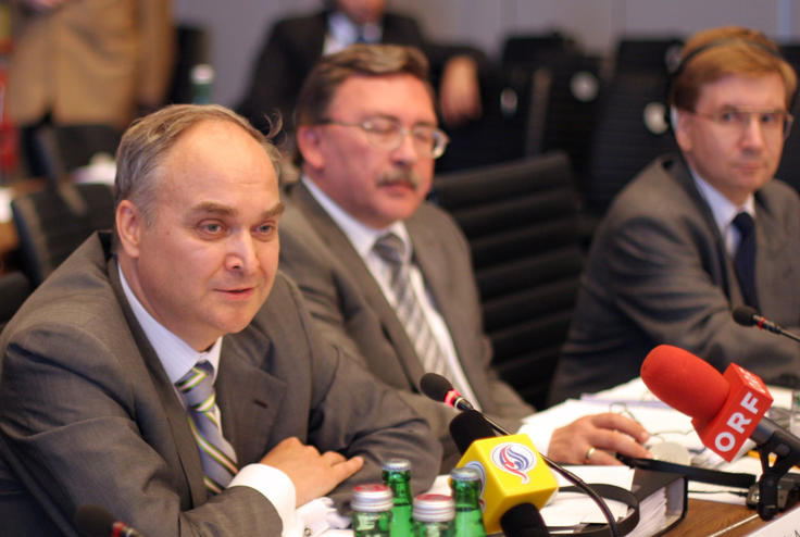 The head of the Russian Delegation to the CFE Conference, Anatoly Antonov, at a news conference at the Hofburg in Vienna, 11 June 2007.