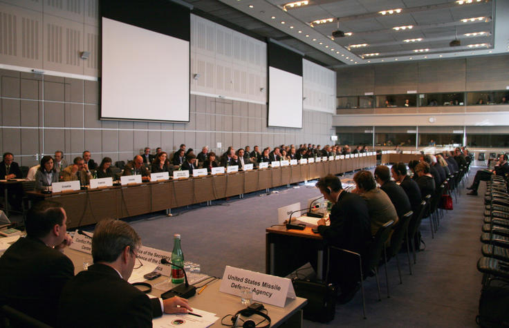 Delegations of the 56 OSCE participating States, including Russia and the United States, discuss the missile defence initiative at a meeting of the Forum for Security Co-operation, in Vienna, 31 October 2007.