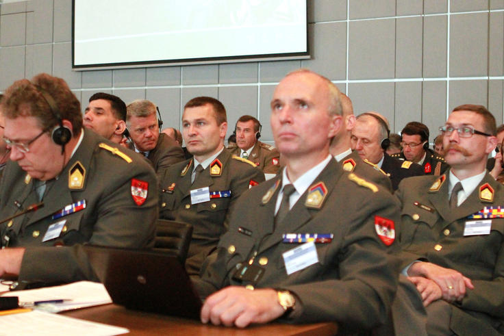 Participants in the OSCE High-Level Military Doctrine Seminar watch a slide presentation. Vienna, 24 May 2011.