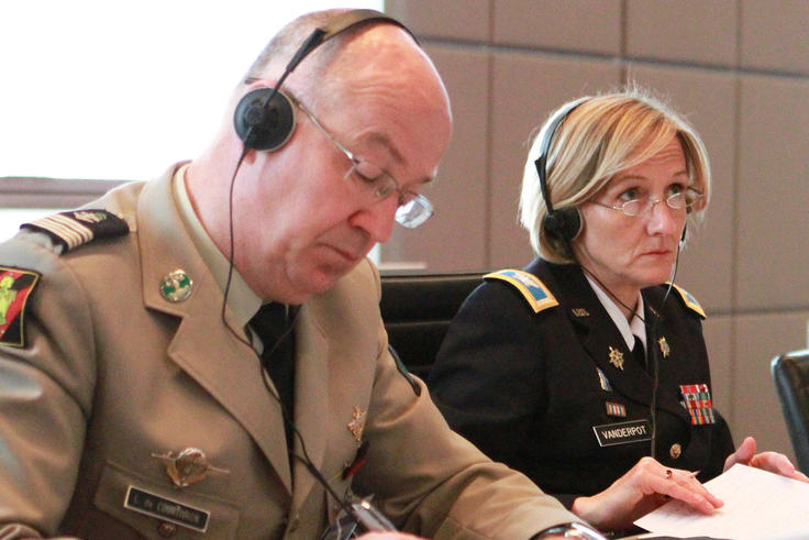 Colonel Louis de Courtivron, Military Adviser in the French delegation to the OSCE, and U.S. Army Colonel Diane Vanderport, Conventional Arms Control Policy Officer, Office of the Secretary of Defence, take notes while serving as rapporteurs during a session of the OSCE High-Level Military Doctrine Seminar. Vienna, 24 May 2011.