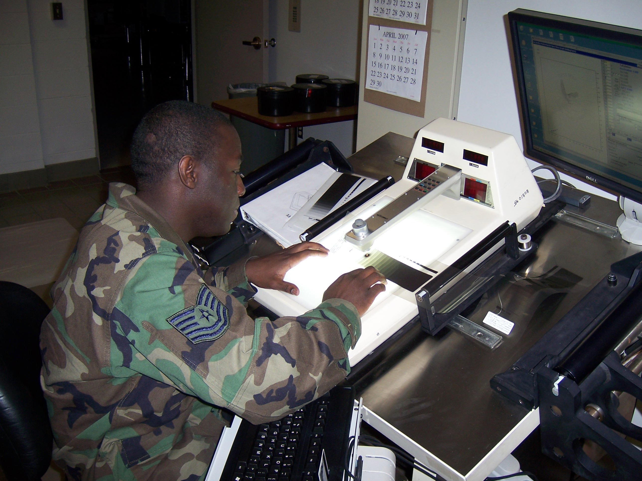 A US serviceman examines a film taken during a flight over Russia under the Open Skies Treaty, 19 March 2007. The Treaty establishes a regime of unarmed aerial observation flights.