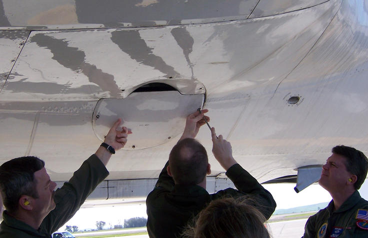 A ground inspection of a plane used to fly under the Open Skies Treaty, 5 August 2005. The Treaty establishes a regime of unarmed aerial observation flights.