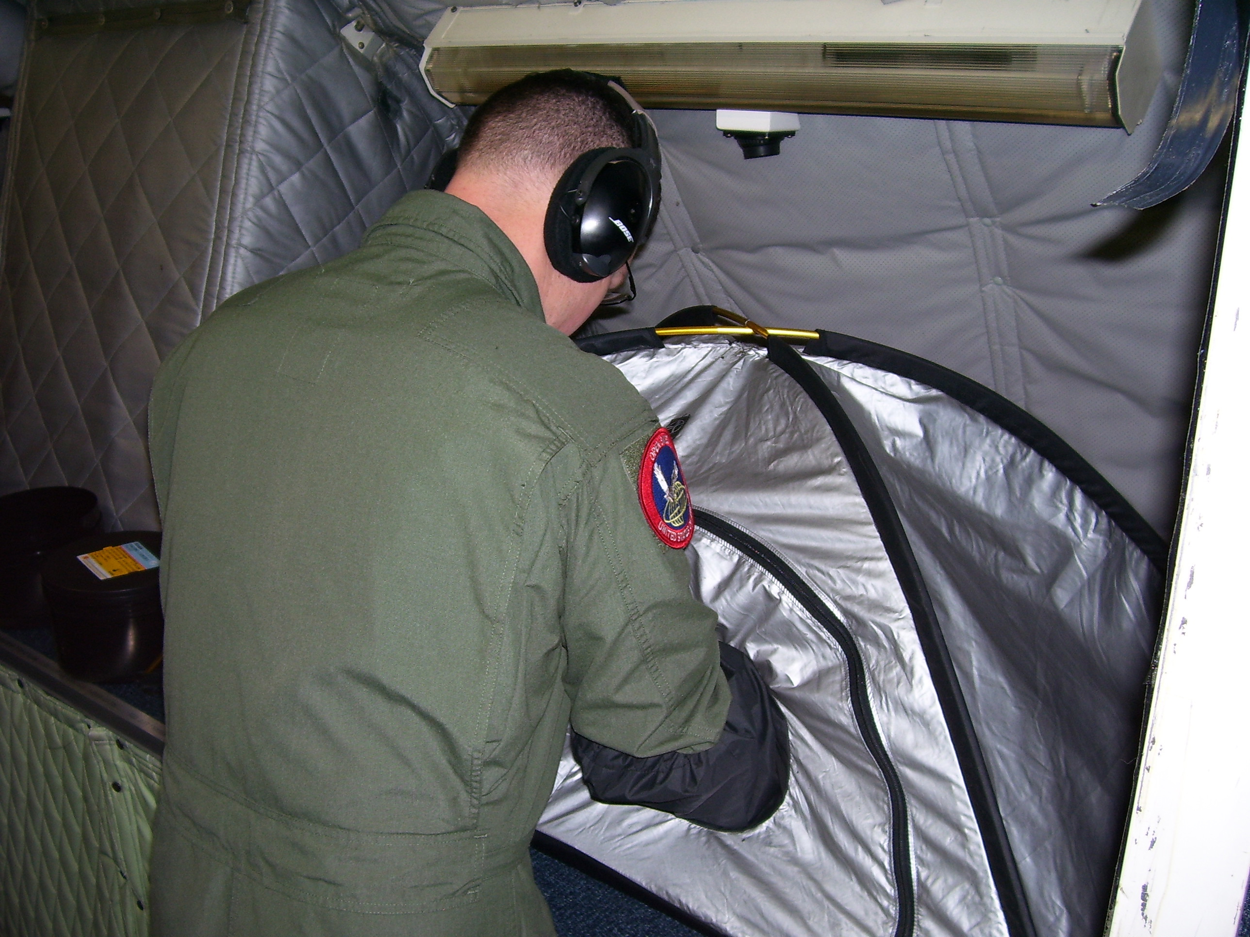 A US serviceman loads film during a flight under the Open Skies Treaty, 22 October 2007. The Treaty establishes a regime of unarmed aerial observation flights.