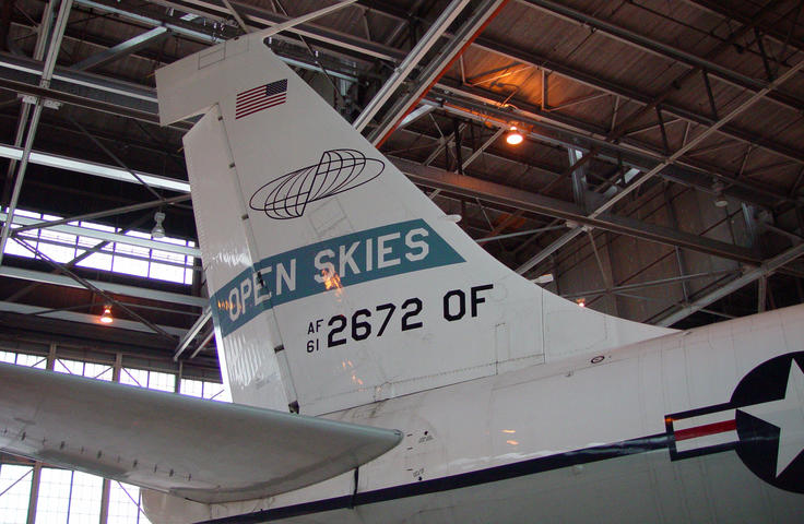 The tail of an OC-135B observation aircraft used by the United States under the Open Skies Treaty during a ground inspection, 6 May 2002. The Treaty establishes a regime of unarmed aerial observation flights.