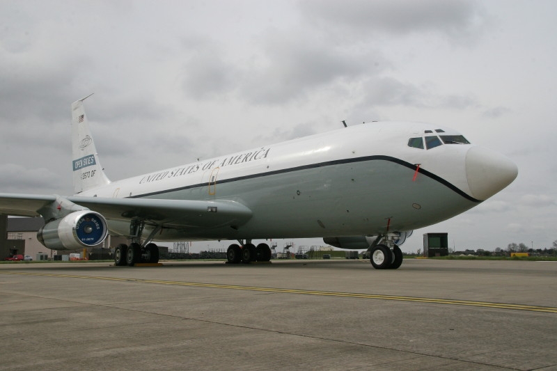 An OC-135B aircraft on the tarmac, 6 April 2008. The plane is used by the United States under the Open Skies Treaty.