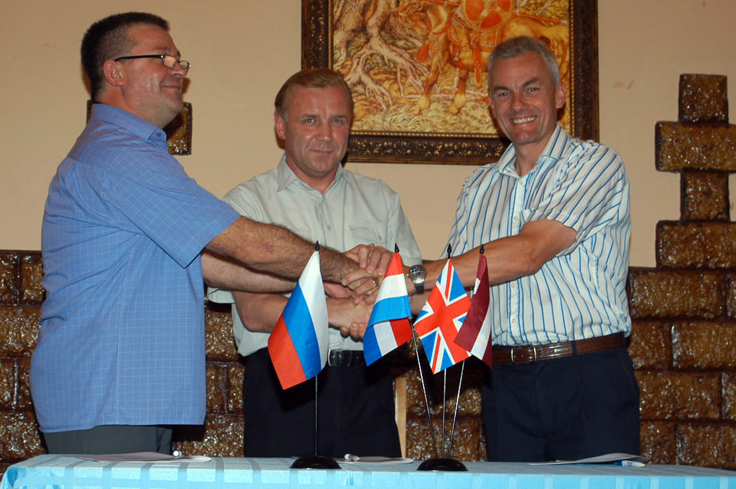 Shaking hands after a joint UK-Croatia flight over Russia, 17 August 2006, under the Open Skies Treaty. Latvian representatives observed the flights.