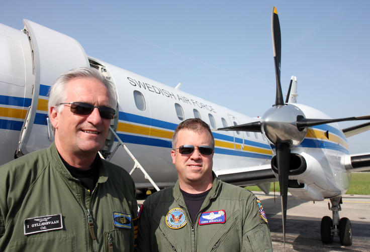 Lt.Col. Ingemar Gyllensvaan (L) and Lt.Col. Chris Weatley, joint commanders of a US-Swedish training flight over Slovakia, 28 May 2008, under the Open Skies Treaty, stand next to a Saab-340B aircraft after the flight.
