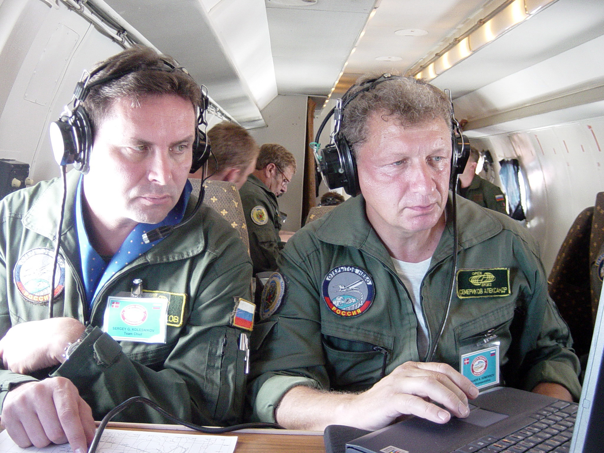 Russian crew members monitor equipment during a flight over Denmark, 10 July 2003, under the Open Skies Treaty.