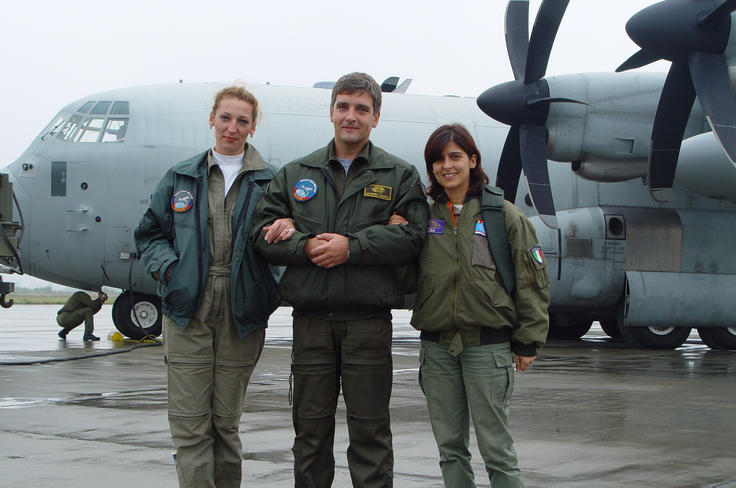 Russian and Italian male and female crew members flying under the Open Skies treaty, 1 October 2004, pose next to a C-130H aircraft.