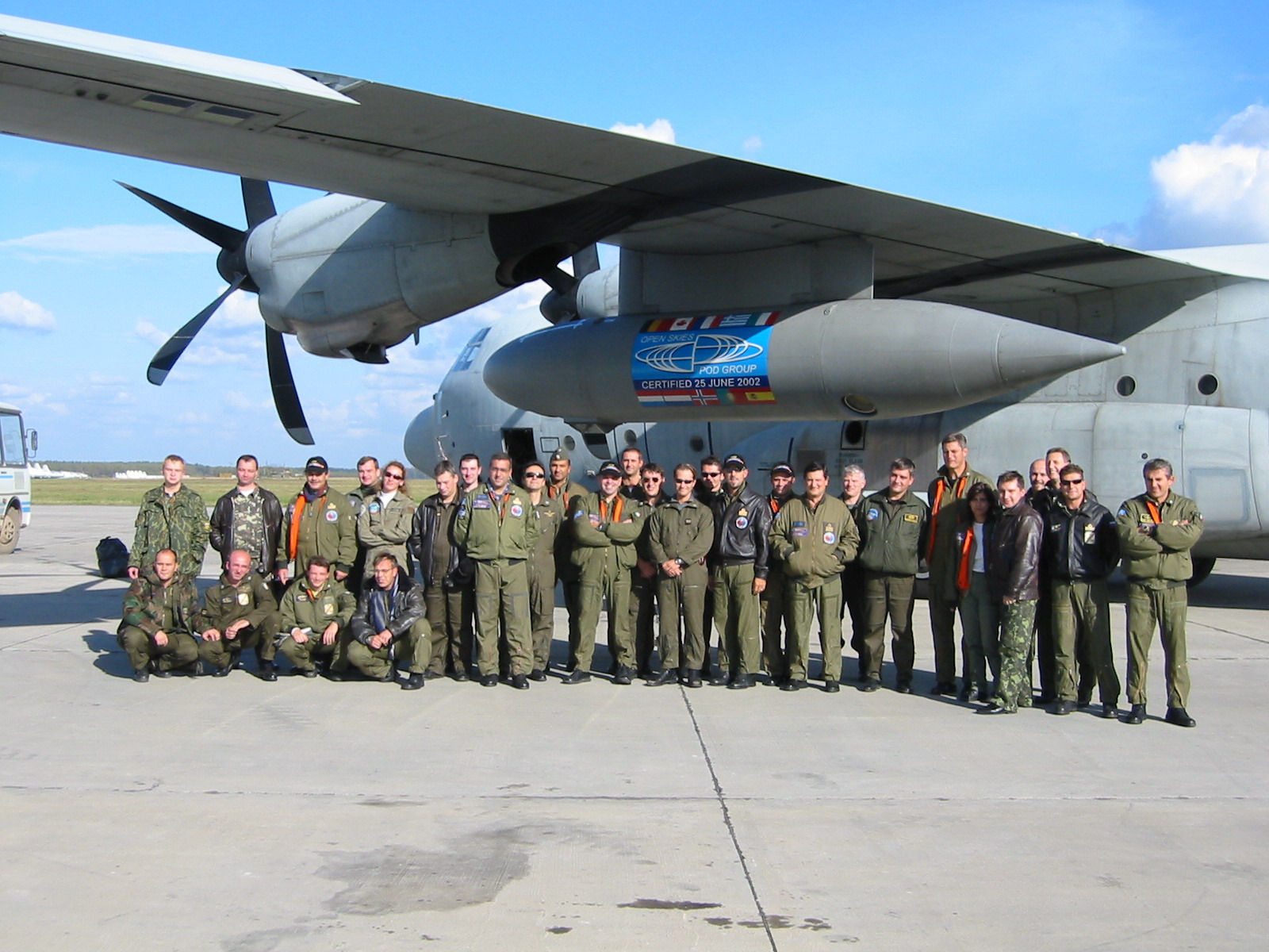 Italian crew members and their Russian counterparts pose next to a C-130H aircraft during flights over Russia, 30 September 2004, under the Open Skies Treaty.