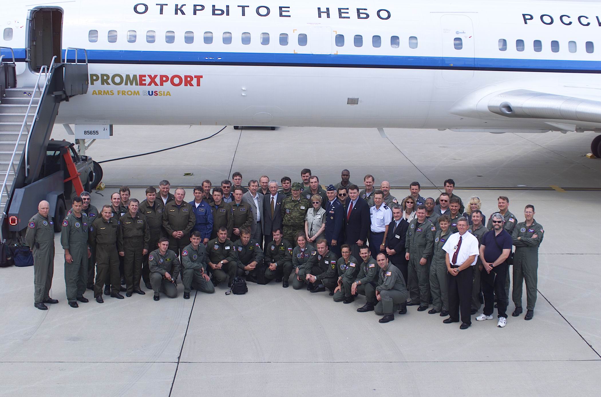 Members of a Russian crew pose on the tarmac next to a Tu-154 aircraft together with their US counterparts during an observation flight over the territory of the United States under the open Skies Treaty, July 2000.