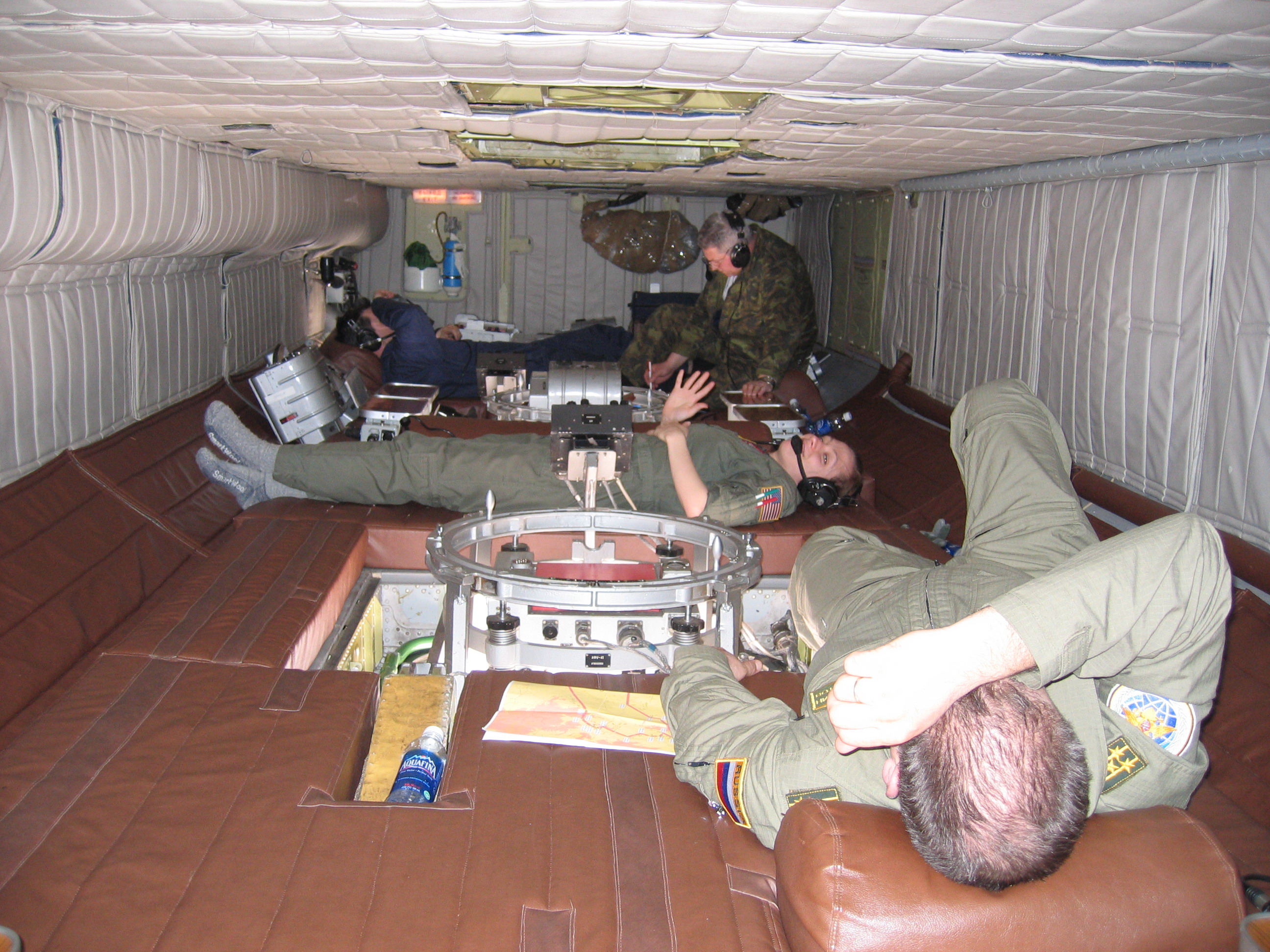 Crew members monitor equipment on board a Russian Tu-154 aircraft during an observation flight over the United States, 20 April 2006, under the Open Skies Treaty.