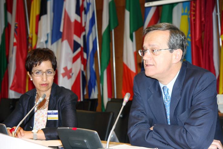 OSCE Secretary General Marc Perrin de Brichambaut addresses a meeting on gender and security between the OSCE, the Council of Europe and the United Nations, while OSCE Senior Adviser on Gender Issues Jamila Seftaoui looks on, Vienna, 14 June 2010.