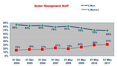 Presenting the Annual Evaluation Report on the OSCE Gender Action Plan, de Brichambaut said: "The OSCE participating States committed themselves to equality between women and men and making it a part of all policies both at their own State level, and within our Organization. The OSCE is on the right track: for the first time in history, the share of women in higher management positions has increased to one third, and 46 per cent of all professional posts are occupied by women."