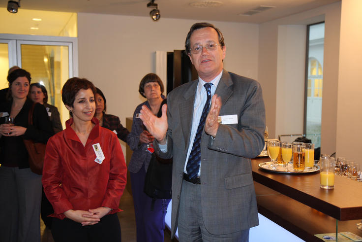OSCE Secretary General Marc Perrin de Brichambaut speaks to participants of an annual meeting of gender focal points at the Secretariat in Vienna, 31 March 2008. On the left is Jamila Seftaoui, Senior Adviser on gender issues.