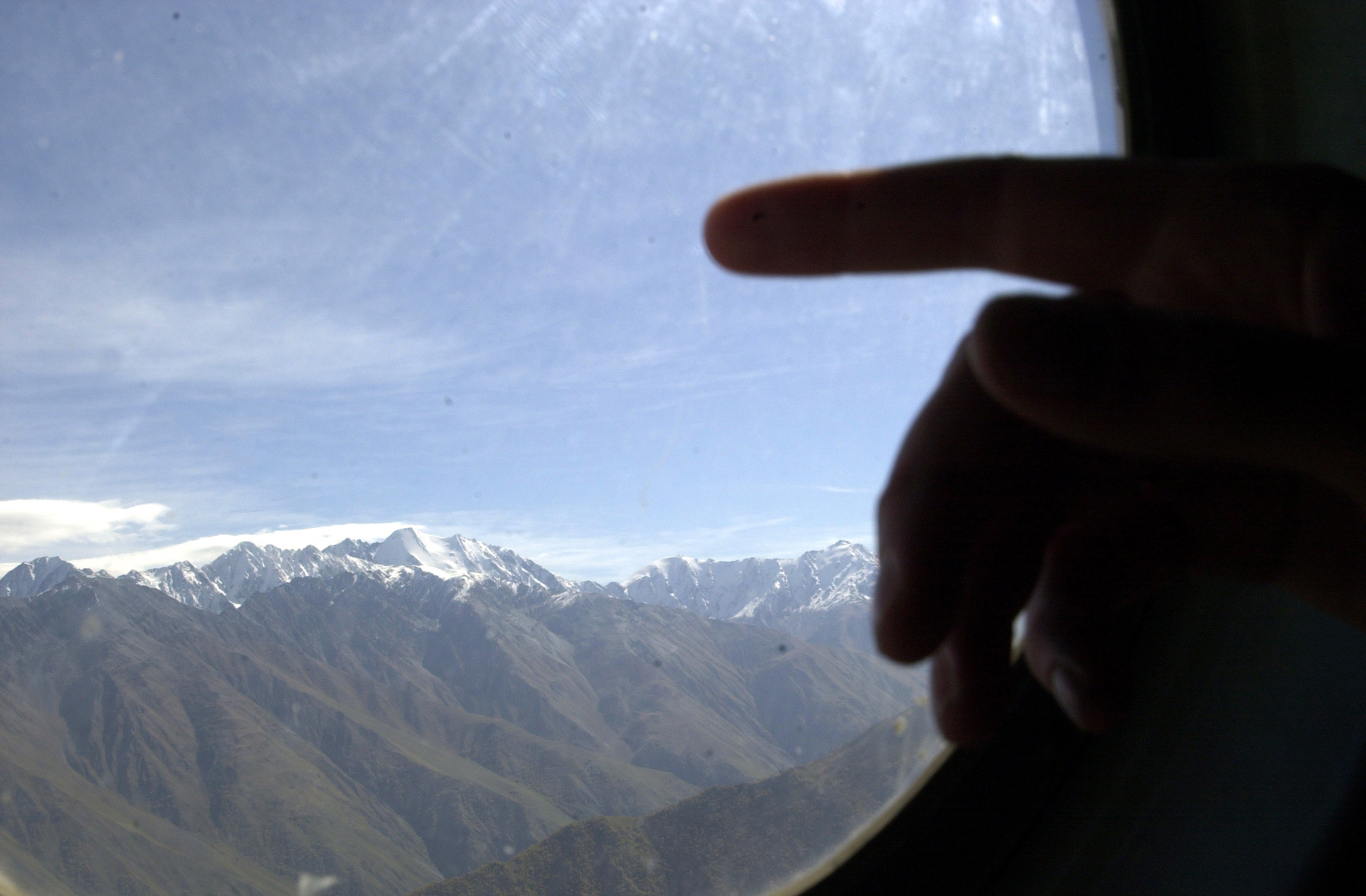A monitor points at the border between Georgia and the Chechen Republic of the Russian Federation, visible through the helicopter porthole.