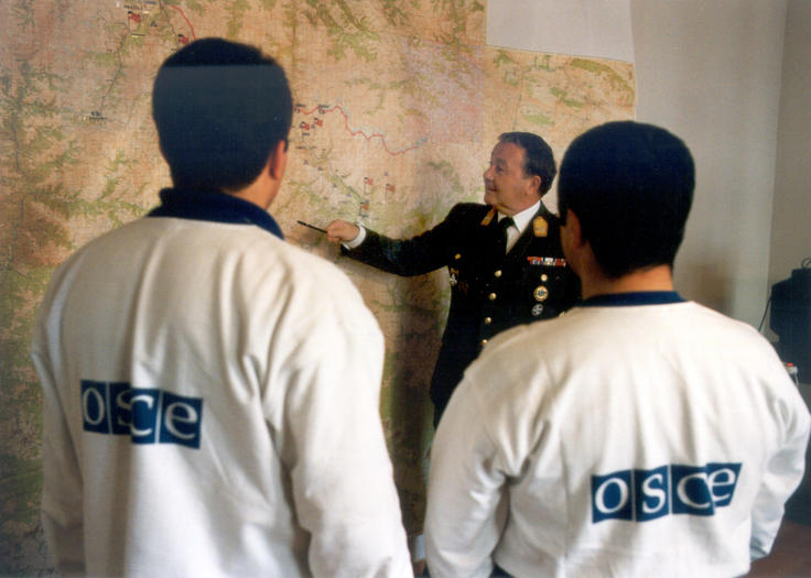 Bernd Lubenik, Head of the OSCE border-monitoring operation in Georgia, briefs monitors, Tbilisi, March 2001.