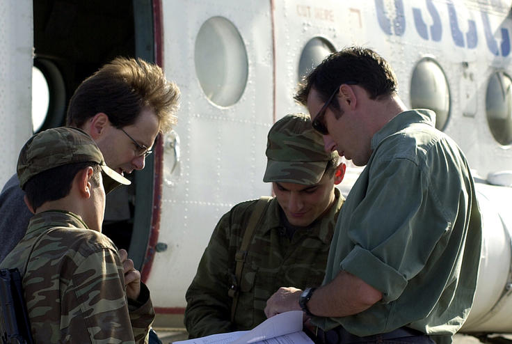Border monitors prepare for take-off with an OSCE helicopter to the Shatili monitoring base.
