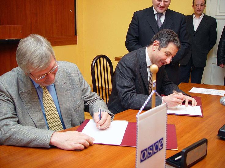 Head of the OSCE Mission, Roy Reeve (left) and Georgian Finance Minister Zurab Nogaideli sign the agreement of OSCE's 1-million-euro contribution for Georgia's general elections, 17 February 2004.