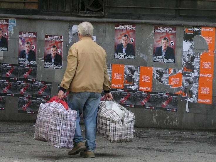 A local Georgian passes election posters as he walks down the sidewalk, Tbilisi, Georgia, 31 October 2003.