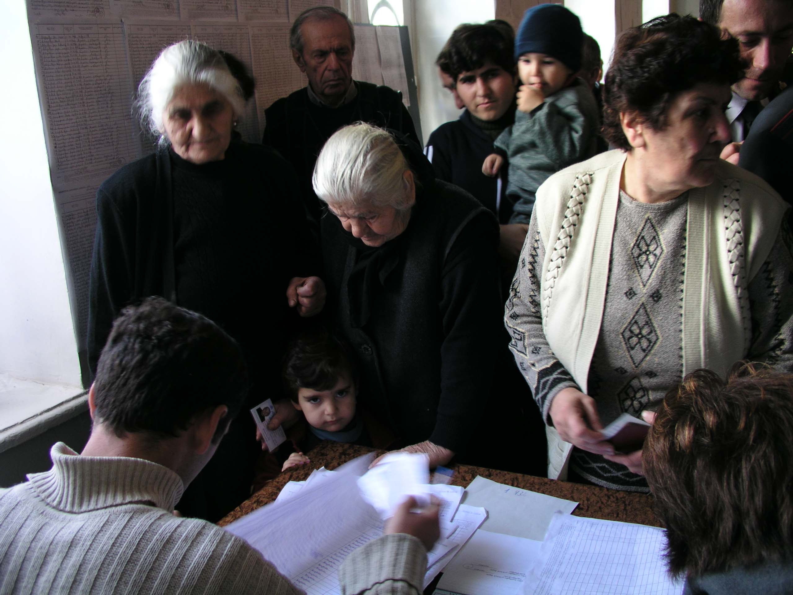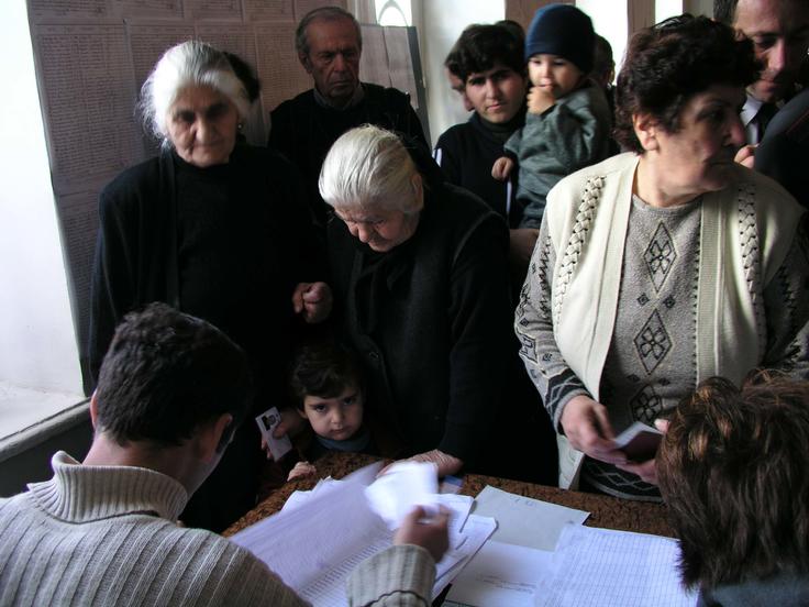 Inside the polling station, local residents complete the steps necessary to vote, Bolnisi, Georgia, 2 November 2003.