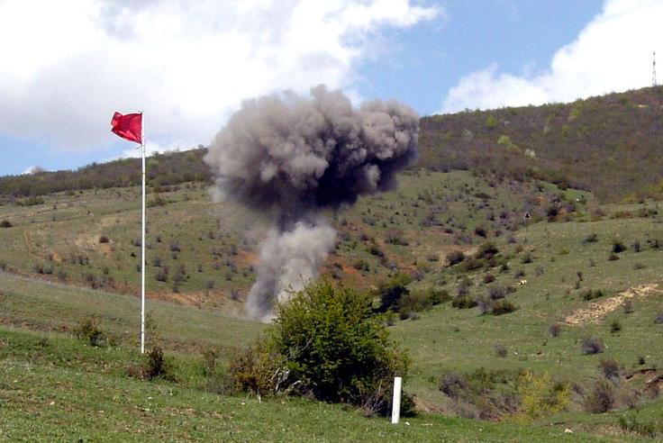 A controlled explosion - destruction of munitions, including land mines, collected under the OSCE Mission to Georgia Rapid Reaction programme in the zone of the Georgian-Ossetian conflict, 29 April 2004.
