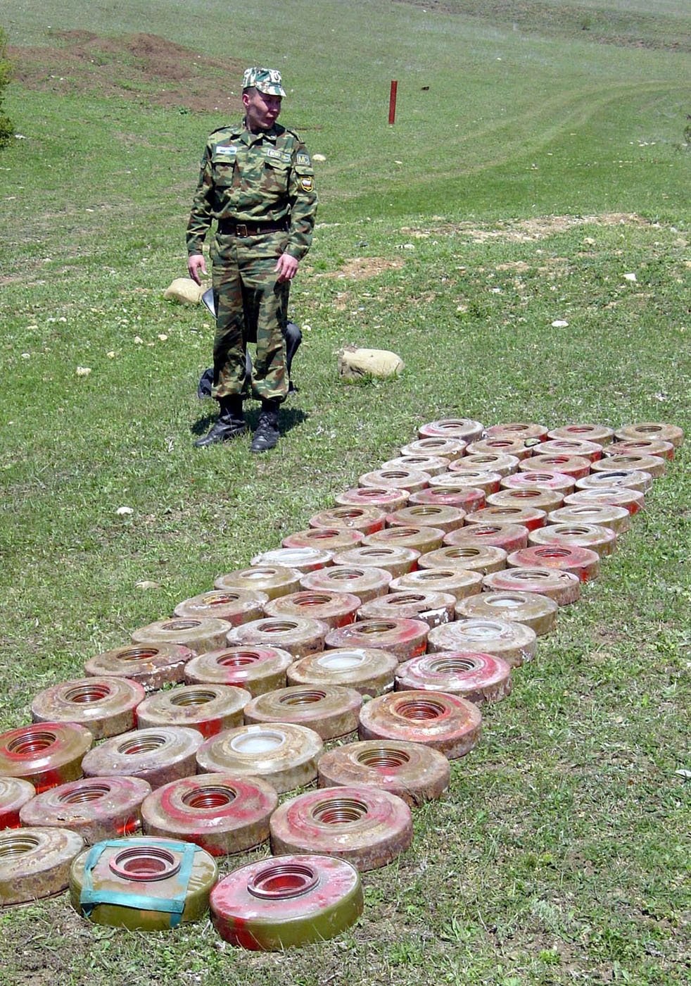 An engineer prepares for destruction mines collected under the OSCE Mission to Georgia Rapid Reaction programme in the zone of the Georgian-Ossetian conflict, 29 April 2004.