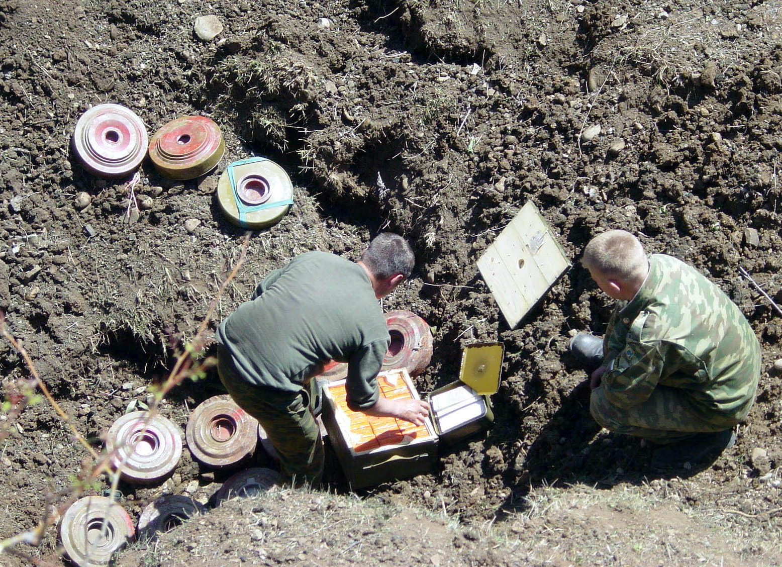 Engineers prepare for destruction mines collected under the OSCE Mission to Georgia Rapid Reaction programme in the zone of the Georgian-Ossetian conflict, 29 April 2004.